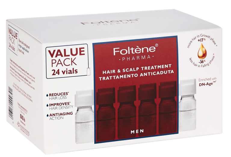 Tricosaccaride®: Foltène® PHARMA exclusive active ingredient, is a mixture of natural mucopolysaccharides that promotes healthy, abundant and resistant hair, thanks to its stimulating and strengthening action. Additionally, it balances the lack of essential nutrients, helping the restoration of scalp’s natural conditions and the reduction of hair loss.